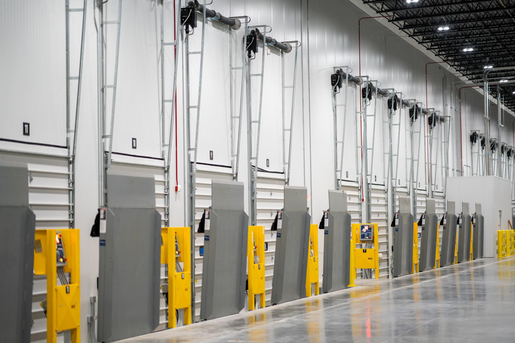 This warehouse and distribution facility features tilt-up concrete construction with a multi-colored painted exterior accented by metal panels. The building includes 22 dock doors, a two-story 7,200-square-foot office, dry goods storage, and an 11,500-square-foot shell space reserved for future tenant buildout. Sophisticated temperature-controlled environments were central to the project, with 35,100 square feet of conditioned space including a 16,000-square-foot cold dock maintained at 40 degrees. Three distinct temperature zones ranging from 36 to 50 degrees accommodate varying produce storage and ripening requirements. Big-D self-performed all concrete work, including site and structural components. The scope also encompassed complete site development with utilities, paving, and landscaping.