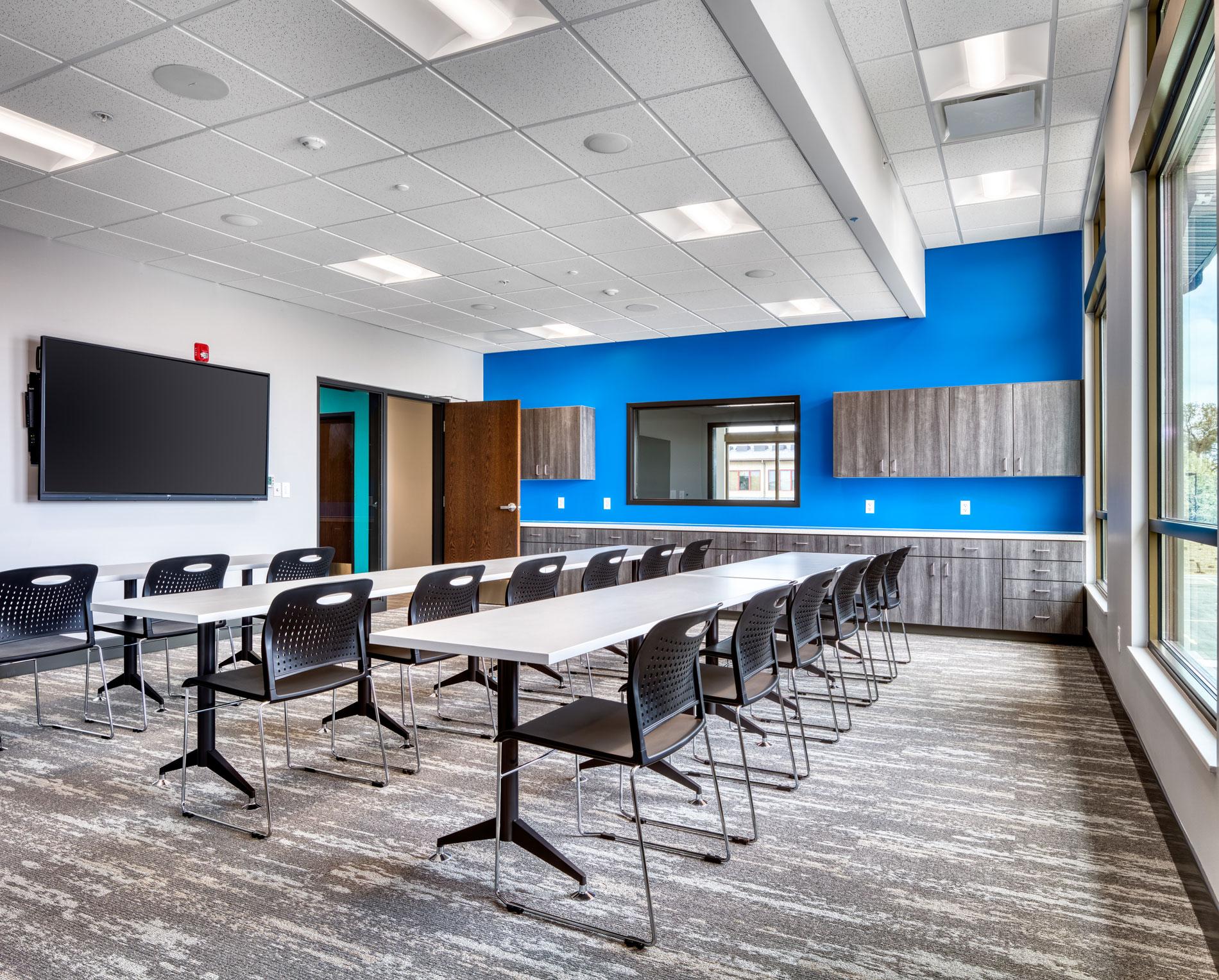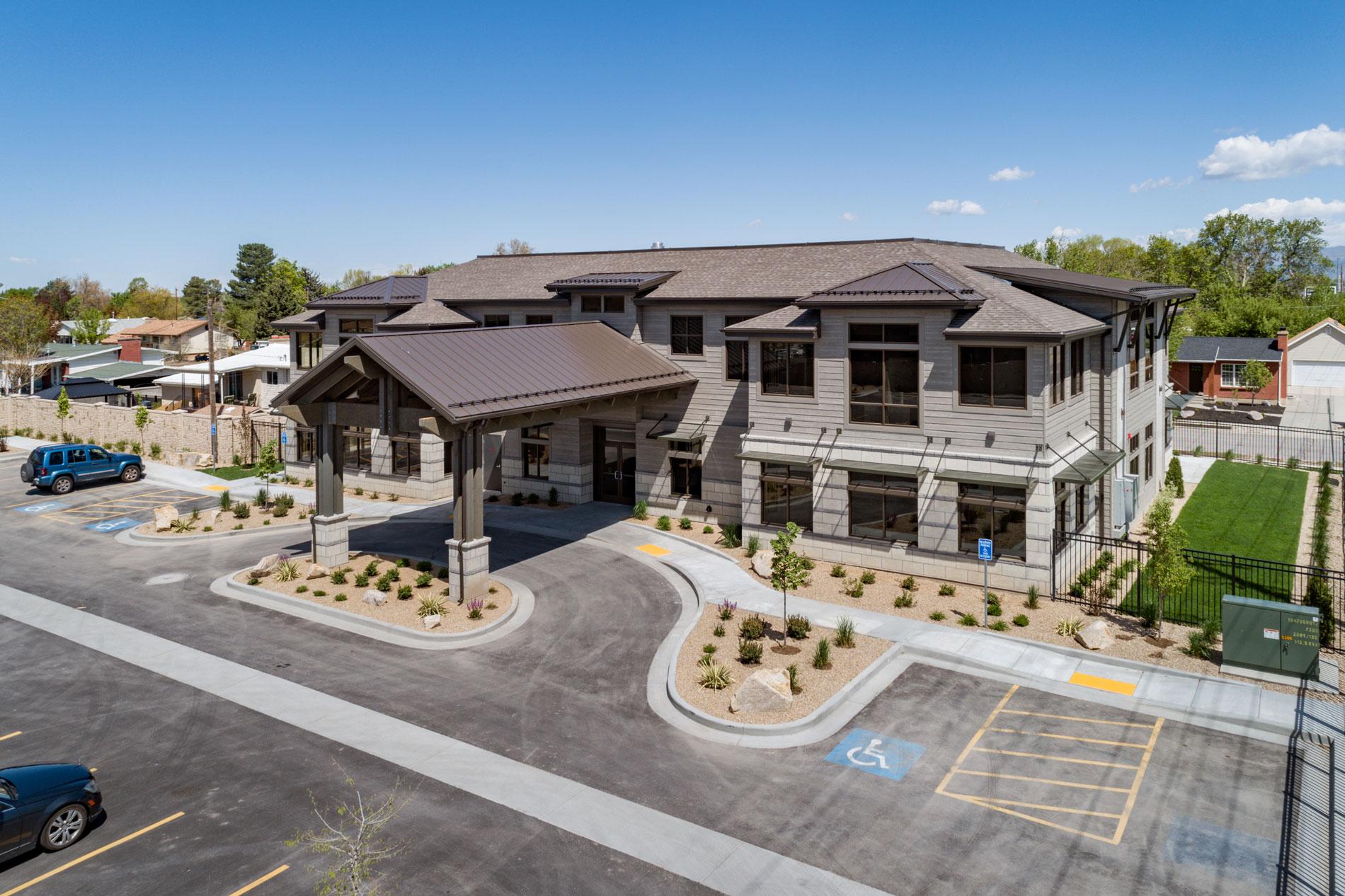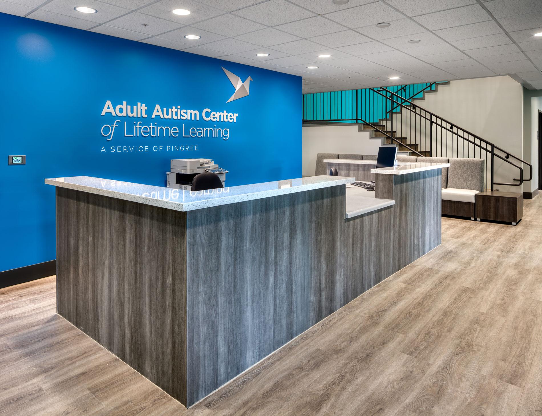 The Adult Autism Center is a facility to serve adults autism and other developmental disabilities and enable clients to acquire the necessary skills for daily living. The project is a new, two-story building and included all site and utility work, and landscaping. The building exterior features stone tile and siding façade, steel awnings at the first-floor windows, a porte-cochère entrance with rustic, exposed beams while maintaining a residential scale feel. Inside the Center, spaces include Reception and Waiting Areas, Client Break Room, Observation Rooms, Home Living Training Room with mock kitchen and restrooms, Fitness Education Room with basic fitness apparatuses, Vocational Training Room, Medical, Dental & Barber Areas, Commissary, Client Classroom, Offices, Conference Room, Staff/Facility Full Kitchen, Library & Media Room, Quiet Rooms, Social & Leisure Room, Shared/Common Office, and various Staff Support areas.